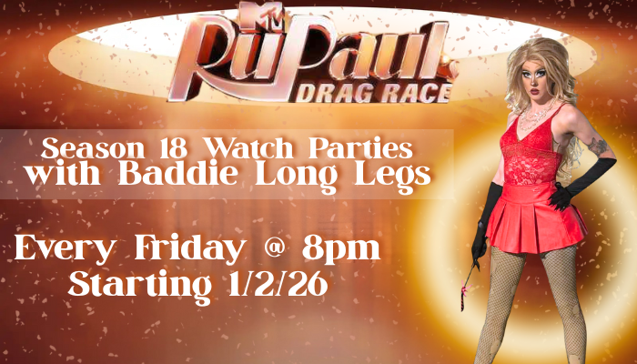 Drag Race Watch Parties are back on Friday January 2nd at 8pm with Baddie Long Legs!